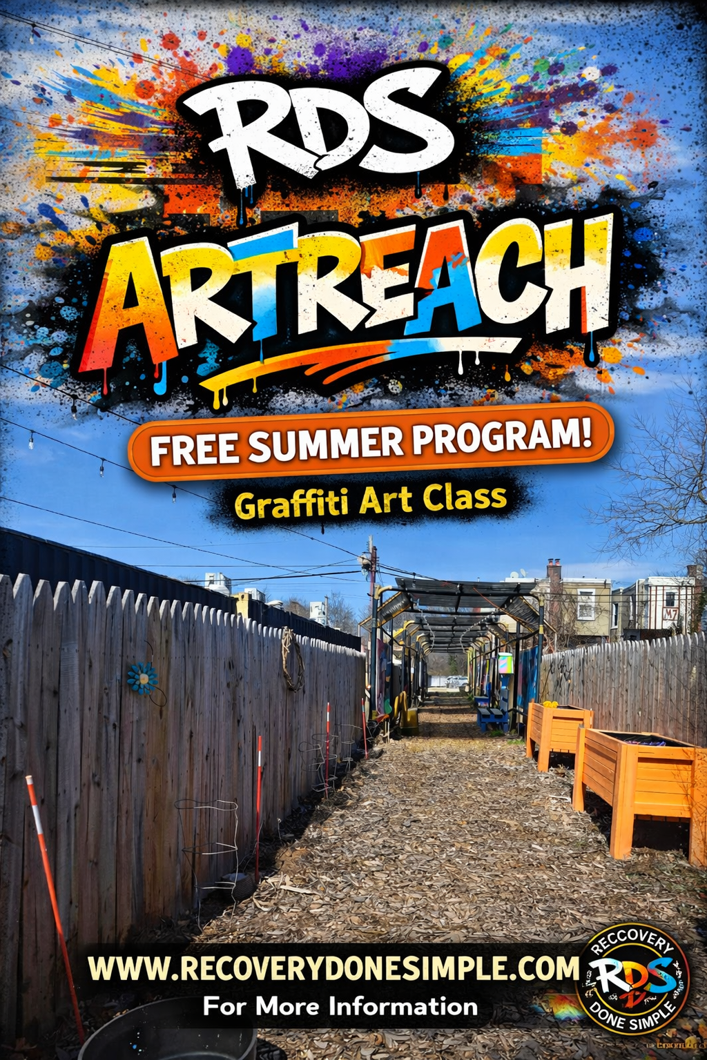 Recovery Done Simple (RDS) is proud to introduce ArtReach, a free community-based street art program designed to engage at-risk youth through creative expression, mentorship, and positive community connection. This program will provide participants with hands-on instruction in graffiti and street art from experienced, respected artists while fostering confidence, discipline, and artistic growth.